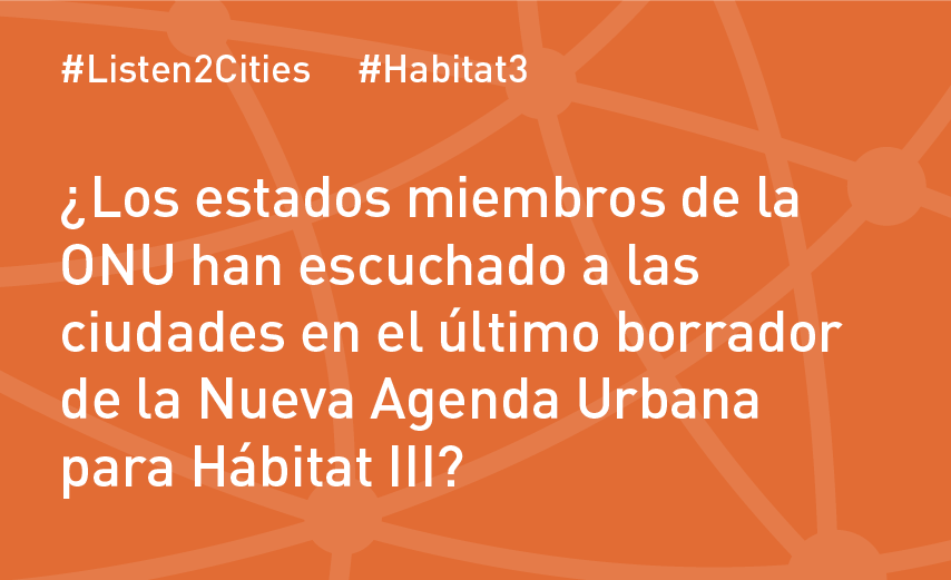 Hoy invitamos a estas redes locales a celebrar su influencia sobre el nuevo borrador de la Agenda, publicado el 18 de julio, y a continuar la campaña en las redes sociales para que los estados escuchen a las ciudades (#Listen2Cities) en la tercera Comisión preparatoria (PrepCom3) en Surabaya, la última oportunidad importante para nosotros para alzar la voz antes de la Conferencia Hábitat III de Quito en octubre.