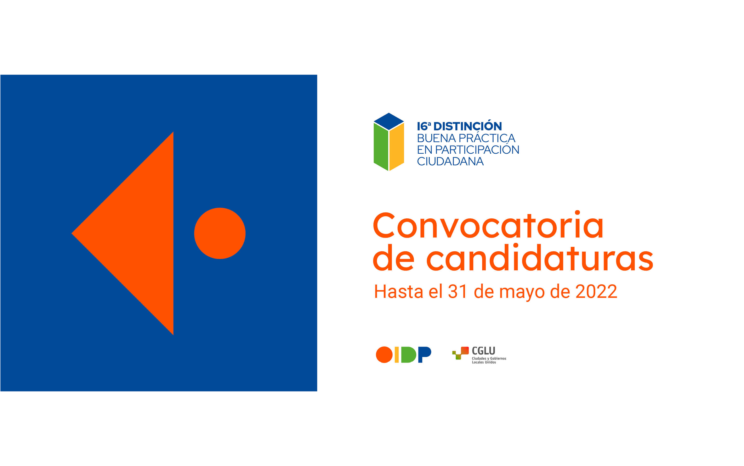 El Observatorio Internacional de la Democracia Participativa (OIDP) y Ciudades y Gobiernos Locales Unidos (CGLU) invitan a los gobiernos locales y regionales a presentar su propuesta para la 16ª edición del premio. Este premio se entrega anualmente para reconocer experiencias y políticas públicas exitosas en materia de participación ciudadana, fortalecimiento comunitario, innovación democrática, deliberación pública y gobierno abierto.