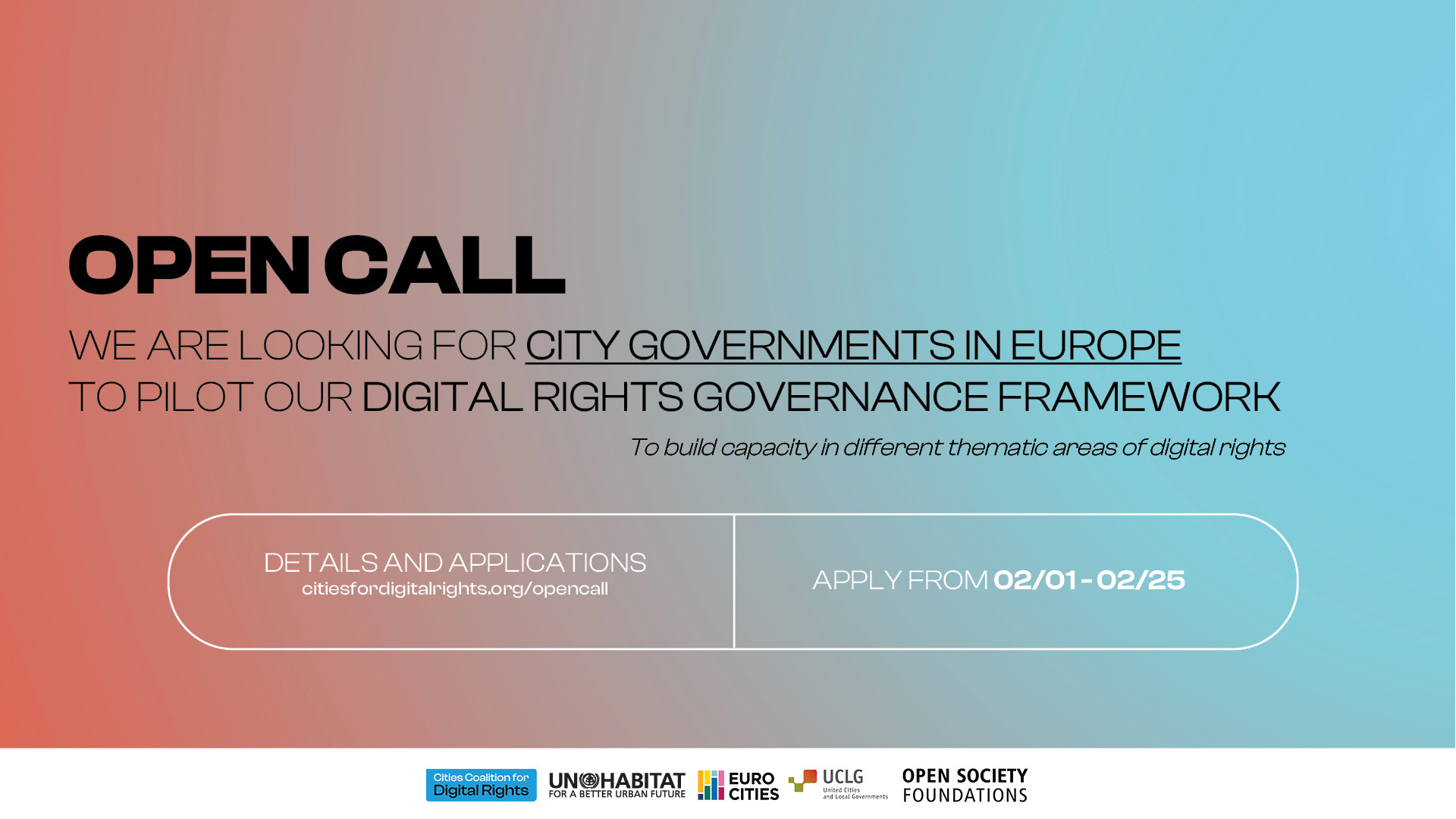 The Cities Coalition for Digital Rights led by the city of Amsterdam, Barcelona and New York City in partnership with United Cities and Local Governments, UN-Habitat, Eurocities, and Open Society Foundations, is launching an open call for experts and city governments to pilot the Digital Rights Governance Framework.
