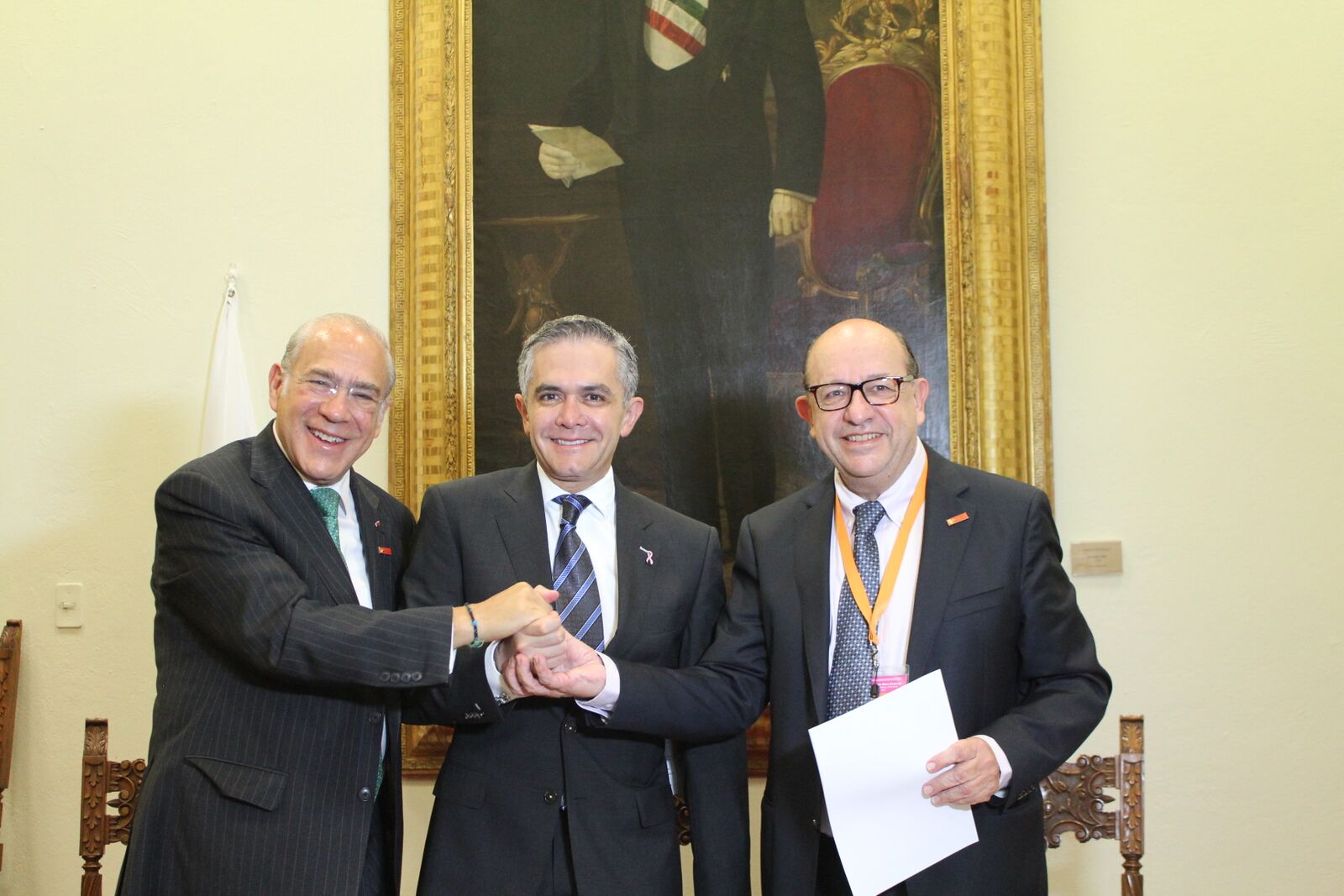 Angel Gurria, secrétaire général de l'Organisation de Coopération et de Développement Économiques (OCDE) et Josep Roig, Secrétaire général de Cités et Gouvernements Locaux Unis (CGLU) ont signé un Accord Cadre de Partenariat le 16 octobre, en présence du Maire de Mexico, Miguel Mancera, hôte de la Sixième Table ronde des maires et des ministres.